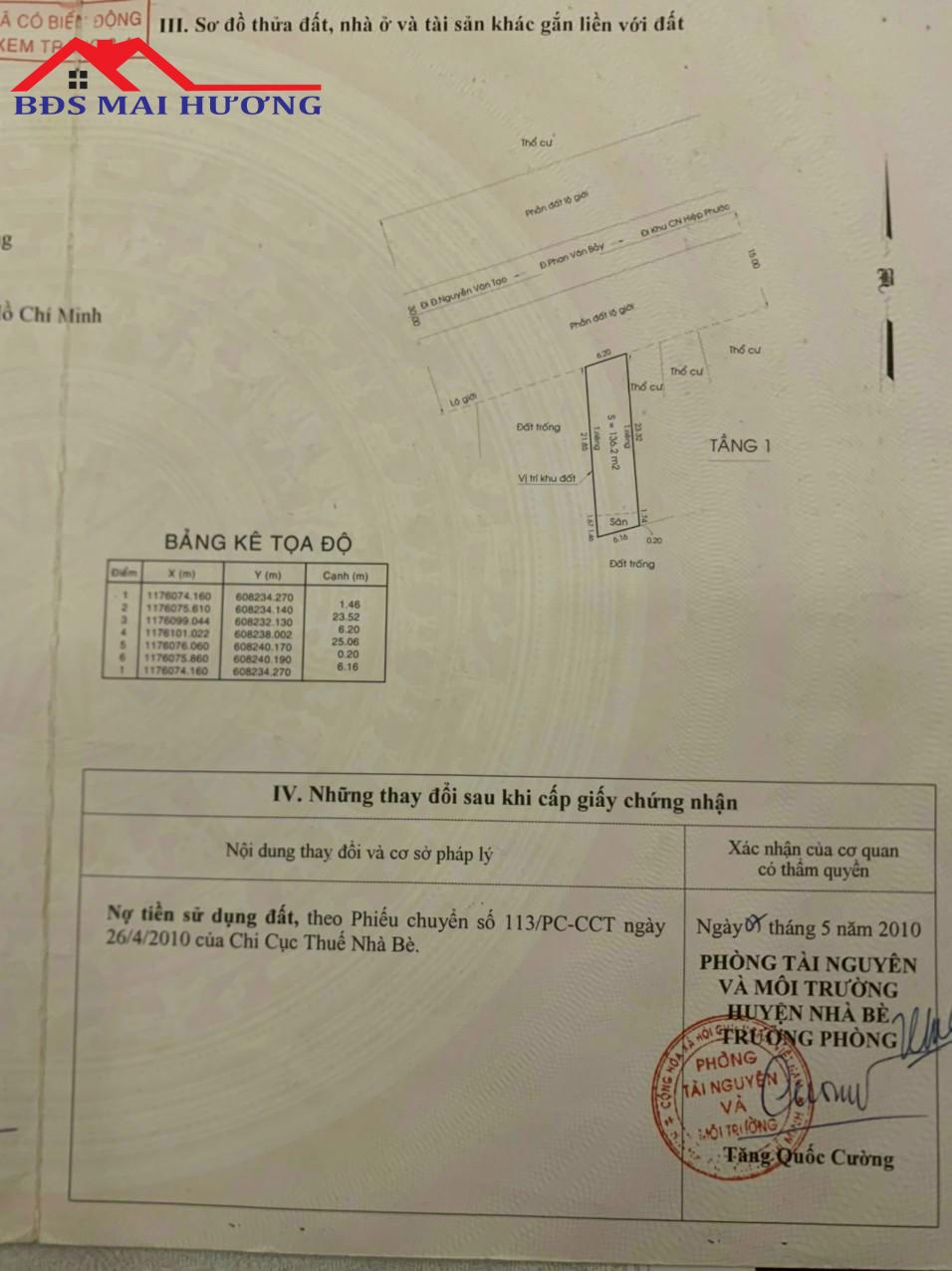 DT: 6,2x25m, công nhận 151m2, đất thổ cư, diện tích xây dựng 130m2,